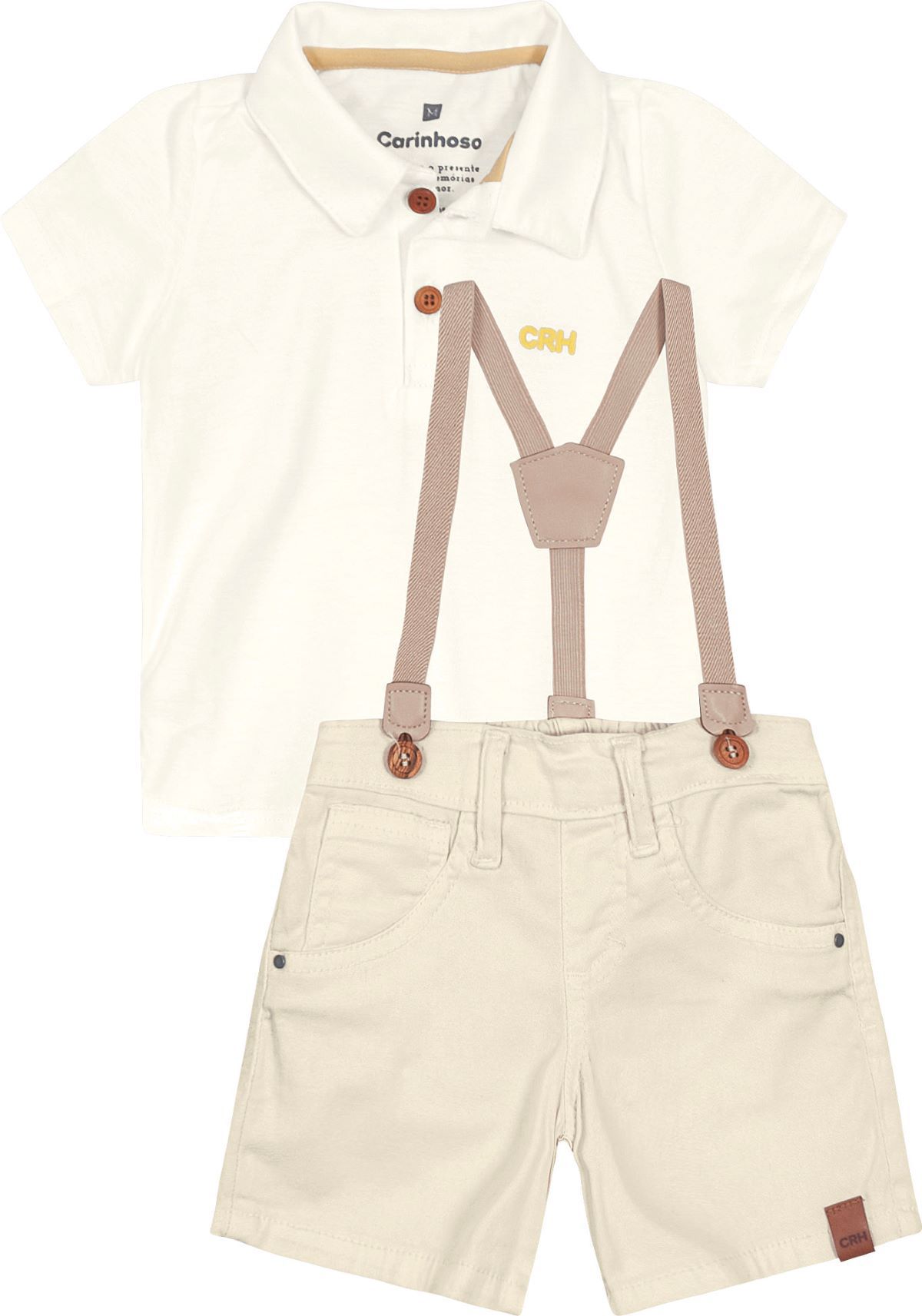 Conjunto confeccionado em meia malha de algodão e sarja com elastano. Parte superior ao estilo Camisa Polo, que conta com gola esporte, peitilho frontal com botões, mangas curtas e bordado no peitoral. Parte inferior em bermuda de sarja com elastano, com cós com passantes e elastico posterior, bolsos frontais e detalhe de etiqueta decorativa na barra. Com acompanhamento de suspensório. Um conjunto casual e sendo ideal para os passeios das crianças!