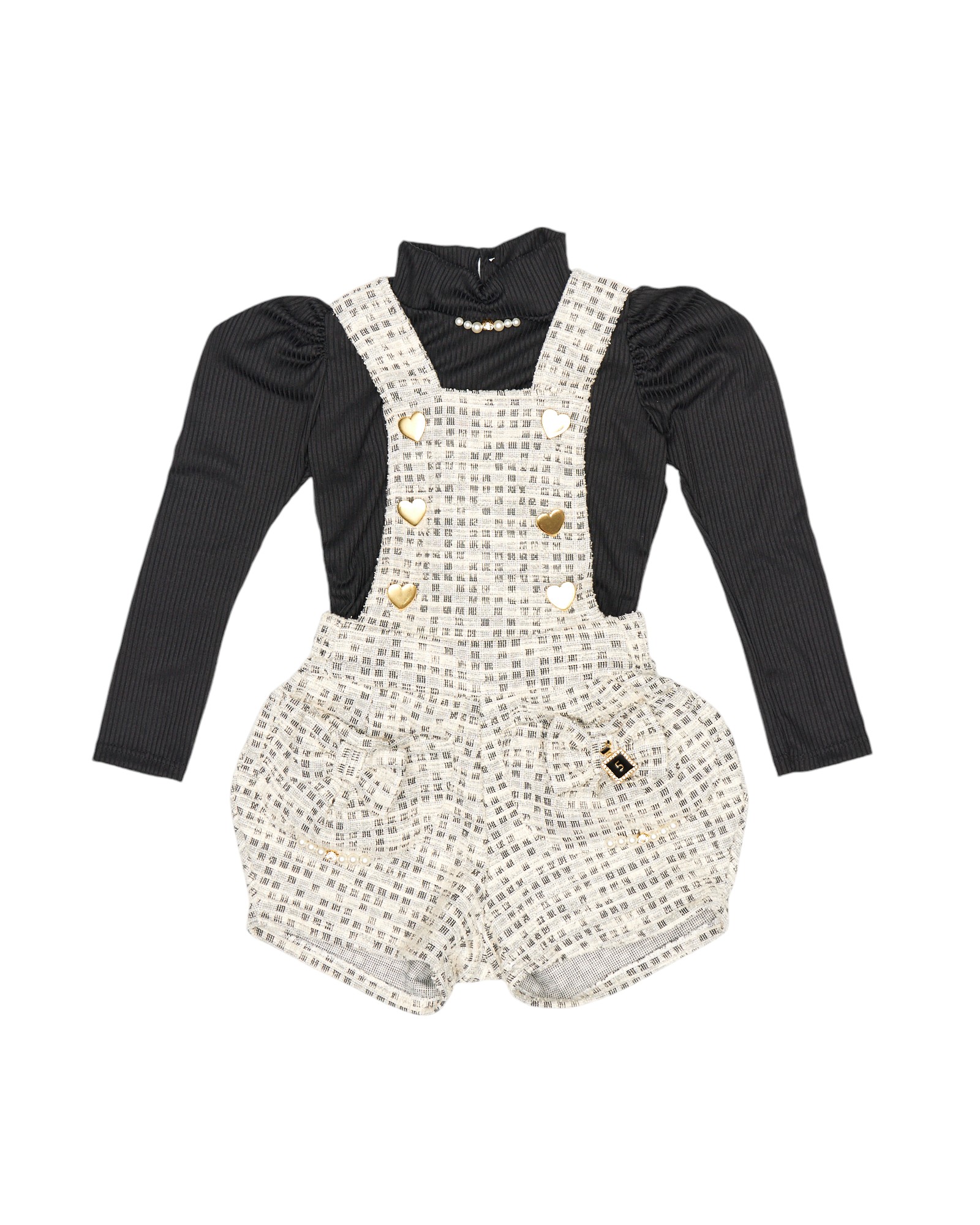 Deixe sua menina ainda mais charmosa com esse conjunto moderno e delicado, ideal para ocasiões especiais ou passeios com muito estilo. A combinação da blusa manga longa com gola alta e detalhe de pérolas com a jardineira curta xadrez cria um look sofisticado e confortável.