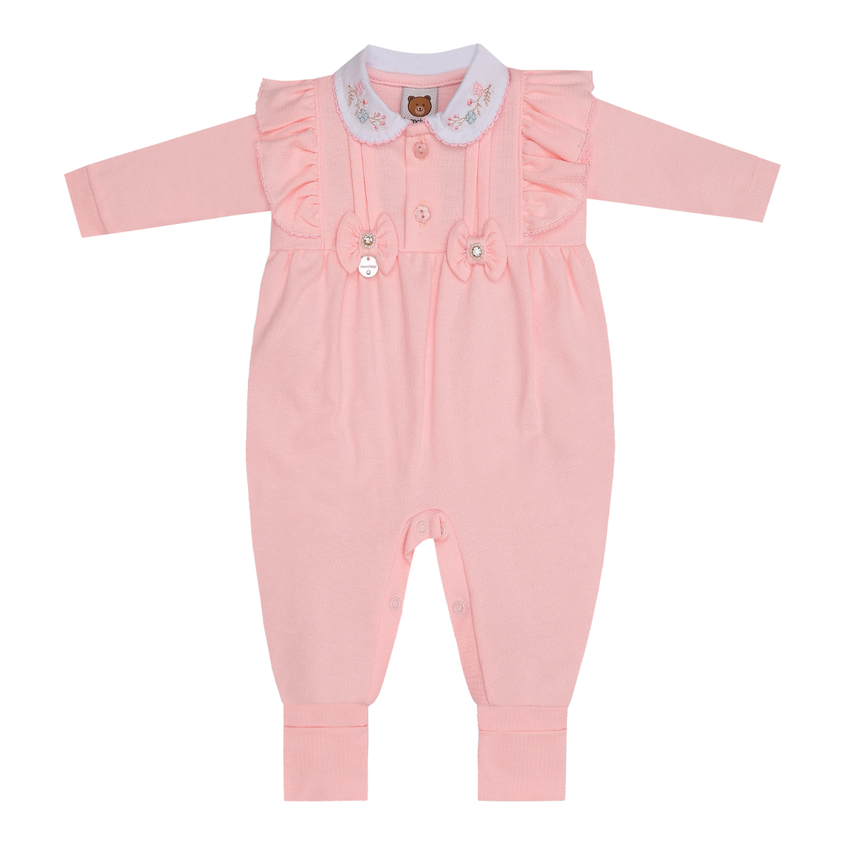 Descrição do Produto: Macacão Bebê Manga Longa com Gola e Bordado – Laço Estiloso – Menina
