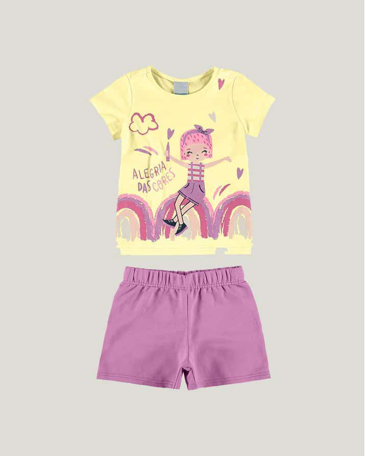 Conjunto infantil confeccionado em meia malha e moletinho leve. Parte superior possui decote redondo, mangas curtas e estampa com glitter de ilustração e os dizeres "Alegria Das Cores". Parte inferior possui cós de elástico franzido e comprimento curto. A meia malha em algodão tem bom caimento, durabilidade e proporciona leveza e frescor ao vestir. Já o moletinho leve é um tecido macio e maleável que promove maior conforto ao vestir. Um conjunto super estiloso para compor os looks da sua pequena. Combine com tênis e jaqueta sobreposta Malwee Kids.