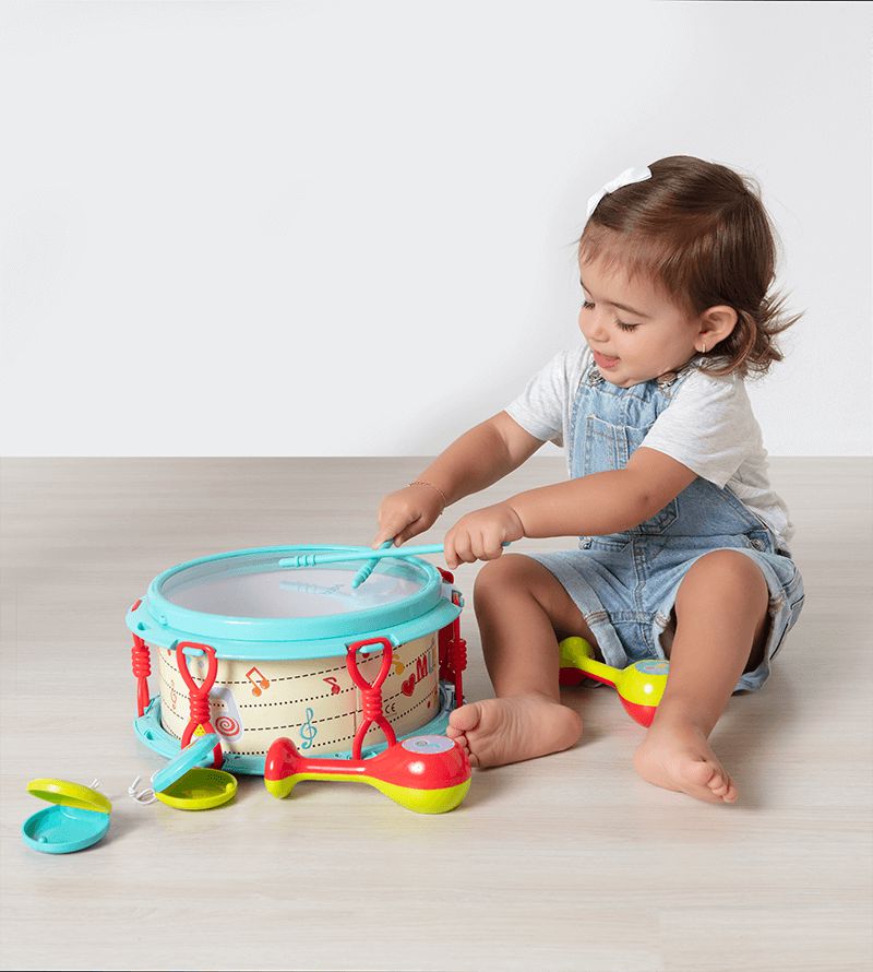 KIT BATERIA É SUPER DIVERTIDO!! COM TAMBOR, BAQUETAS, PANDEIRO, MARCAS E CASTANHOLAS, É IDEAL PARA DESENVOLVER A COORDENAÇÃO MOTORA E OS SENTIDOS DO PEQUENO, ALÉM DE ESTIMULAR O PRIMEIRO CONTATO COM INSTRUMENTOS MUSICAIS.